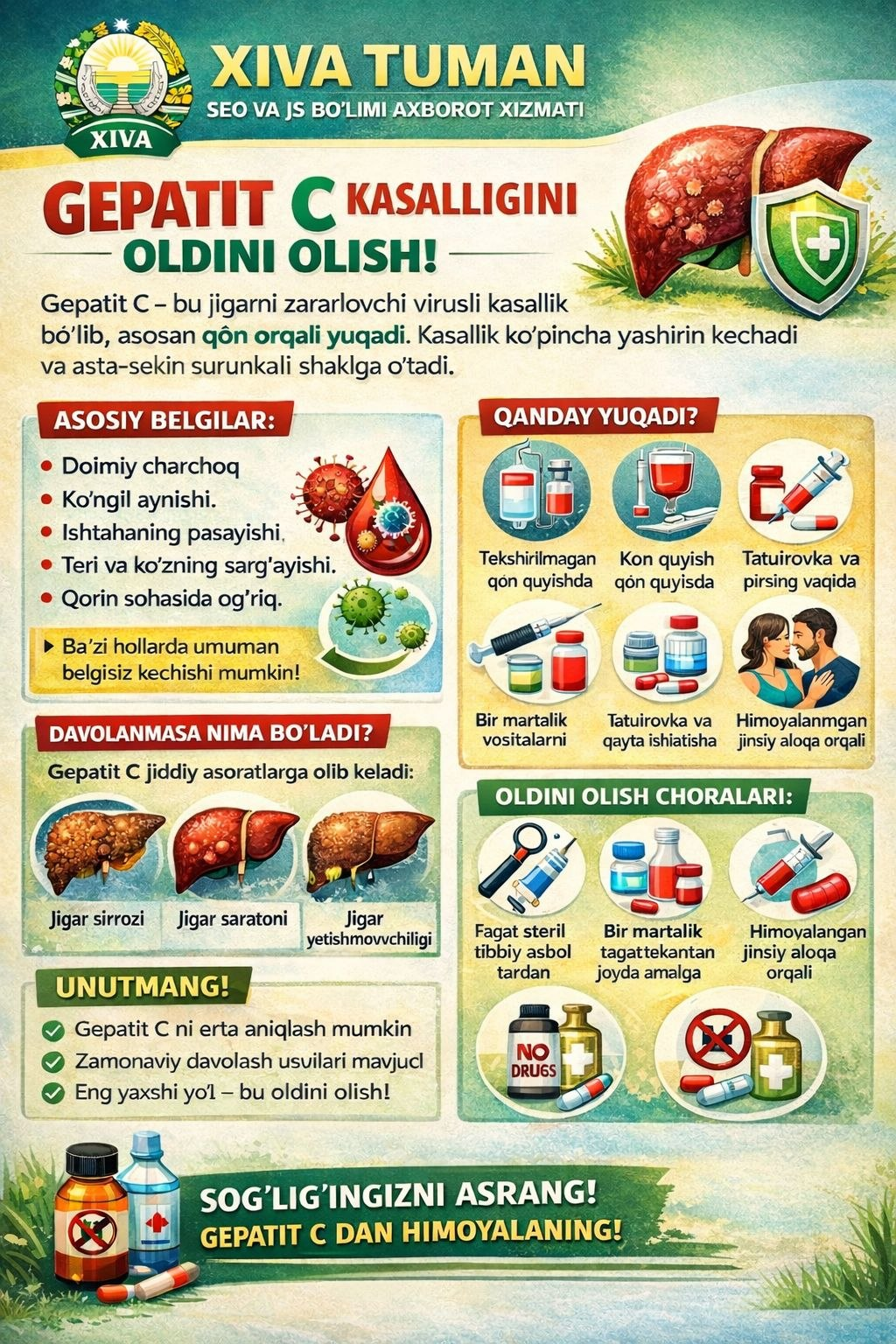 Ushbu infografiya orqali siz Gepatit C kasalligi o'zi nima uni yuqish yo'llari va undan himoyalanish yo'llarini bilib olishingiz mumkin.